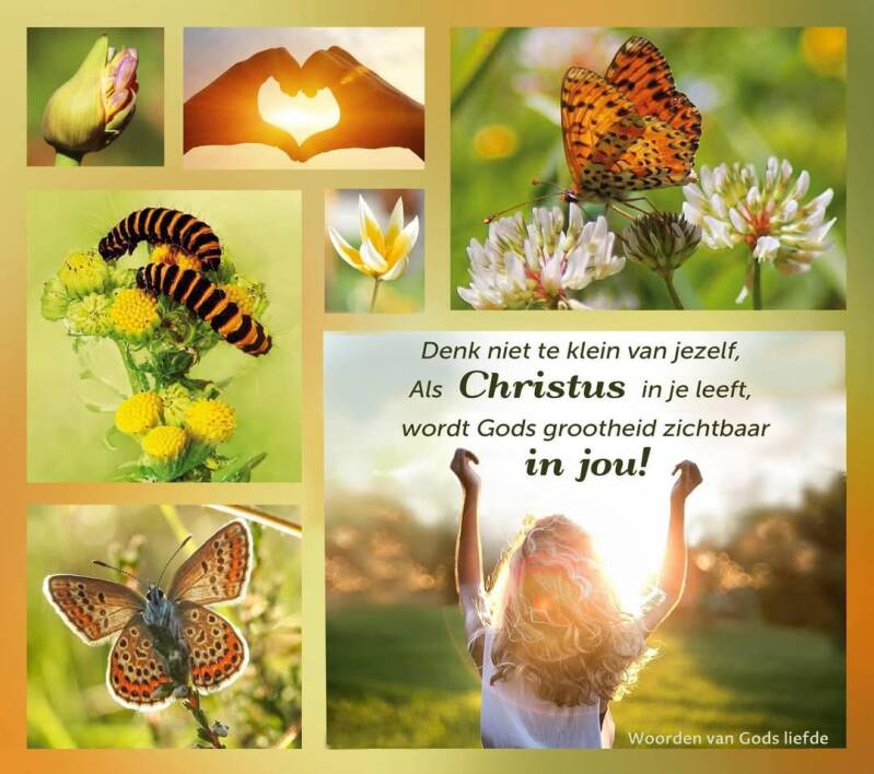 Weet je hoe je nu als een prachtige vlinder je vleugels mag uitslaan? Eenvoudig door te zeggen: ‘Heer, ik kan het niet, het lukt mij niet, maar U woont in mij en U kunt het wél, U bewerkt in mijn leven wat voor mij niet mogelijk is. Ga Uw gang maar!’ En reken maar dat Ik zo’n gebed verhoor, Ik neem alles van je over.
