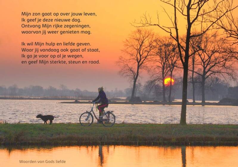 Elke dag opnieuw gaat Mijn zon weer op over jouw leven. Dit is de dag die Ik heb gemaakt. Ik geef je deze nieuwe dag, met nieuwe mogelijkheden en kansen. Je mag je verheugen over Mijn aanwezigheid in je leven, de hele dag door! (Ps.118:24)