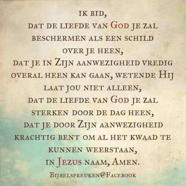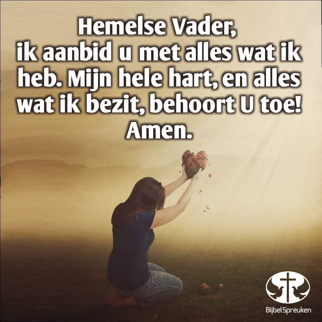 Liefdevolle Vader ........ dank U voor Uw Zoon en Zijn Volbrachte Werk ....... zodat ik door het geloof in Hem een kind van U mag zijn. Want ik geloof met mijn hart en belijd met mijn mond dat Hij naar de aarde kwam om de straf voor mijn zonden te dragen. Hij stierf in mijn plaats, zodat ik eeuwig leven kon ontvangen. Hij heeft gezegd dat Hij de goede Herder is, Die Zijn schapen veilig zal leiden naar grazige weiden. Hij kwam om leven te geven en dat in overvloed. Vergeef mij Vader dat ik meer op mijn eigen oplossingen en inspanningen vertrouwde in plaats van op U te vertrouwen. Ik dank U voor Uw genade en vergeving en bid dat U mij geloof VAN U geeft en dank U dat U mij wilt helpen om de controle volledig los te laten, omdat U alle wijsheid bezit. Dank zodat U mij telkens verhoort wanneer ik bid in de Naam van Jezus. Alle lof, eer en aanbidding is voor U Heer, in Jezus Naam, Amen!